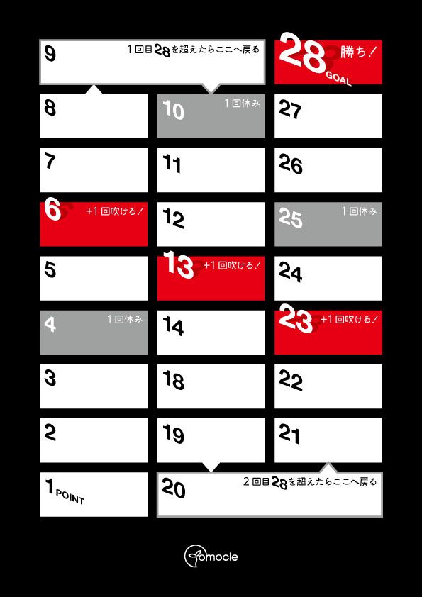 合計がちょうど「28点(フキヤの意味)」になるように、計算しながら吹く!超えてしまったら、9点へ逆戻り♪